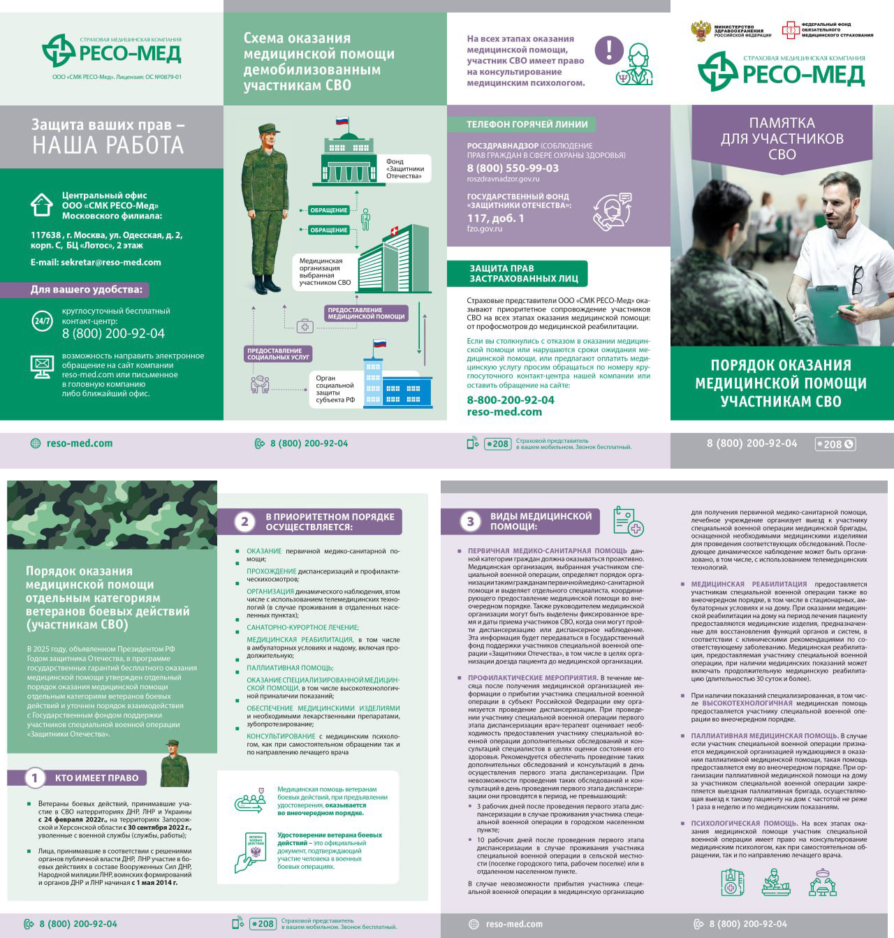 Страховые представители ООО «СМК РЕСО-Мед» оказывают приоритетное сопровождение участников СВО на всех этапах оказания медицинской помощи: от профосмотров до медицинской реабилитации. Если вы столкнулись с отказом в оказании медицинской помощи или нарушаются сроки ожидания медицинской помощи, или предлагают оплатить медицинскую услугу просим обращаться по номеру круглосуточного контакт-центра нашей компании 8-800-200-92-04 или оставить обращение.